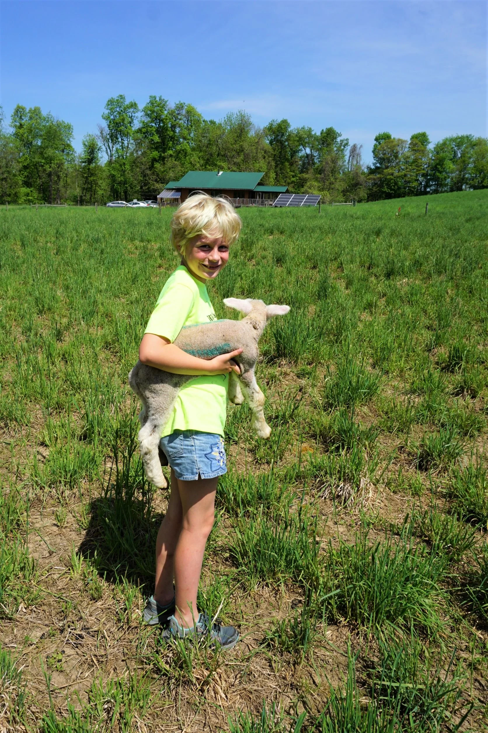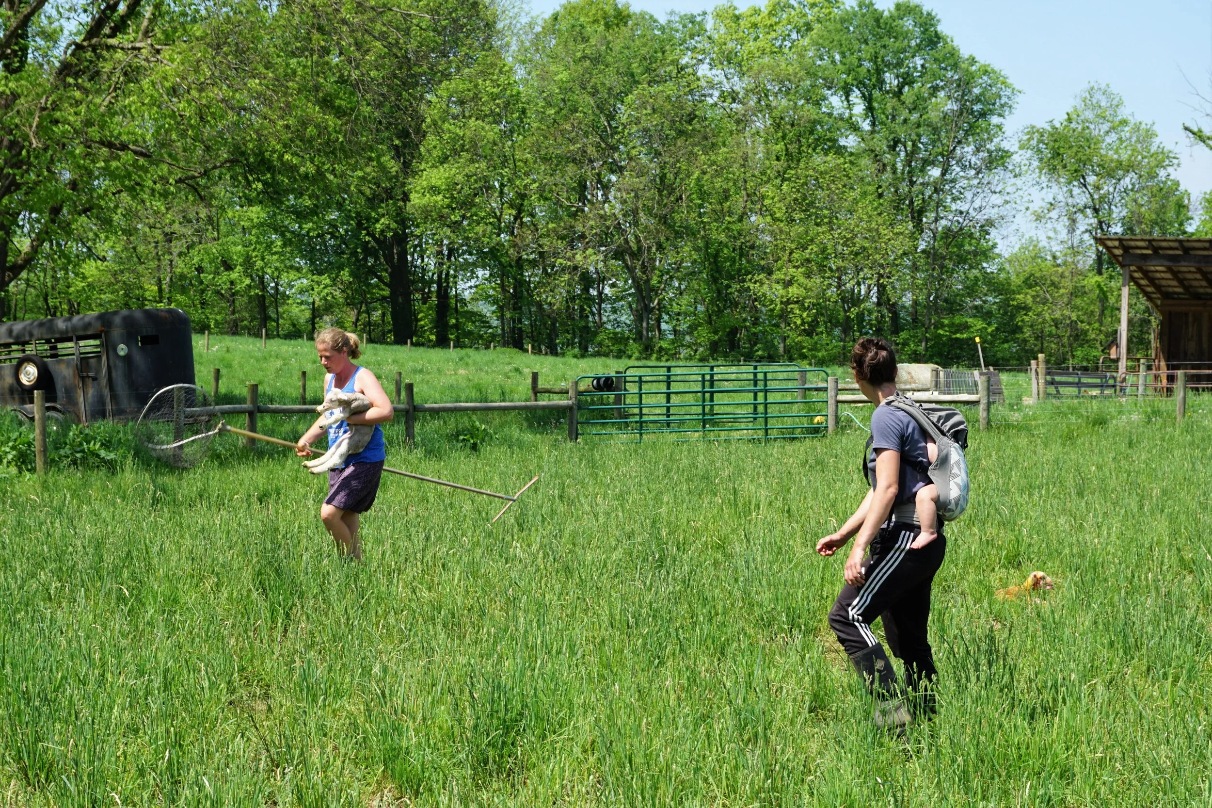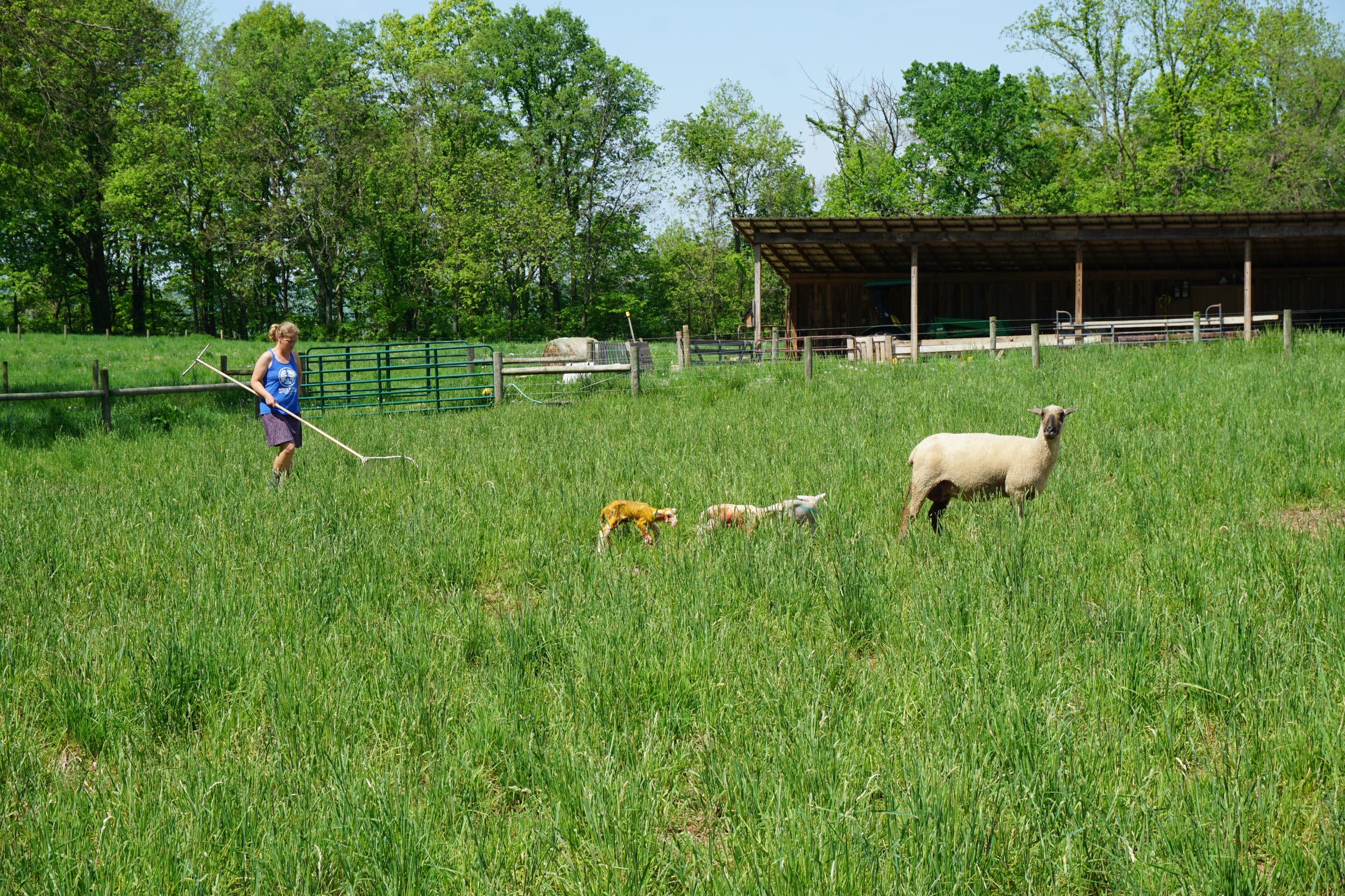 My husband’s sister, Jael, soon arrived with her ten-year-old and seven-year-old. One of the older lambs had been retrieved by its mother, but the other had to be chased by a net-wielding Jael, trapped, and removed to the upper pasture.
